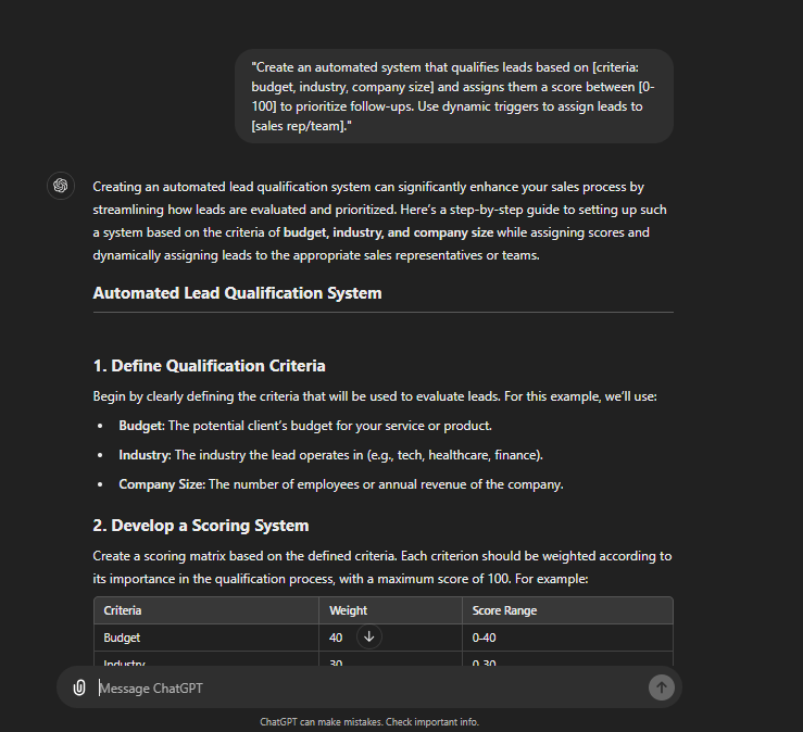 "Create an automated system that qualifies leads based on [criteria: budget, industry, company size] and assigns them a score between [0-100] to prioritize follow-ups. Use dynamic triggers to assign leads to [sales rep/team]."