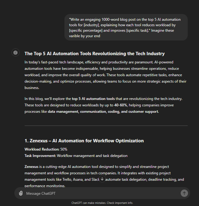 "Write an engaging 1000-word blog post on the top 5 AI automation tools for [industry], explaining how each tool reduces workload by [specific percentage] and improves [specific task]."