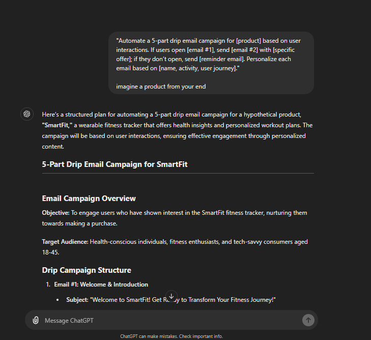 "Automate a 5-part drip email campaign for [product] based on user interactions. If users open [email #1], send [email #2] with [specific offer]; if they don’t open, send [reminder email]. Personalize each email based on [name, activity, user journey]."