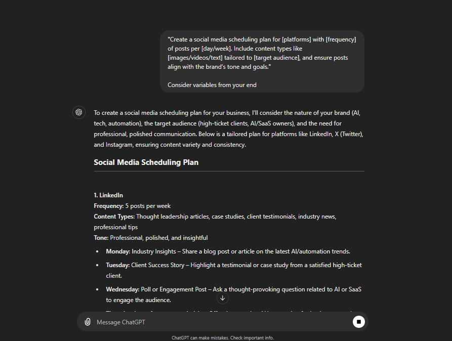 Ensure you provide flexibility in the variables. For example, ask if the user has specific platforms they target, or whether they have different needs for content scheduling (e.g., daily vs. weekly).